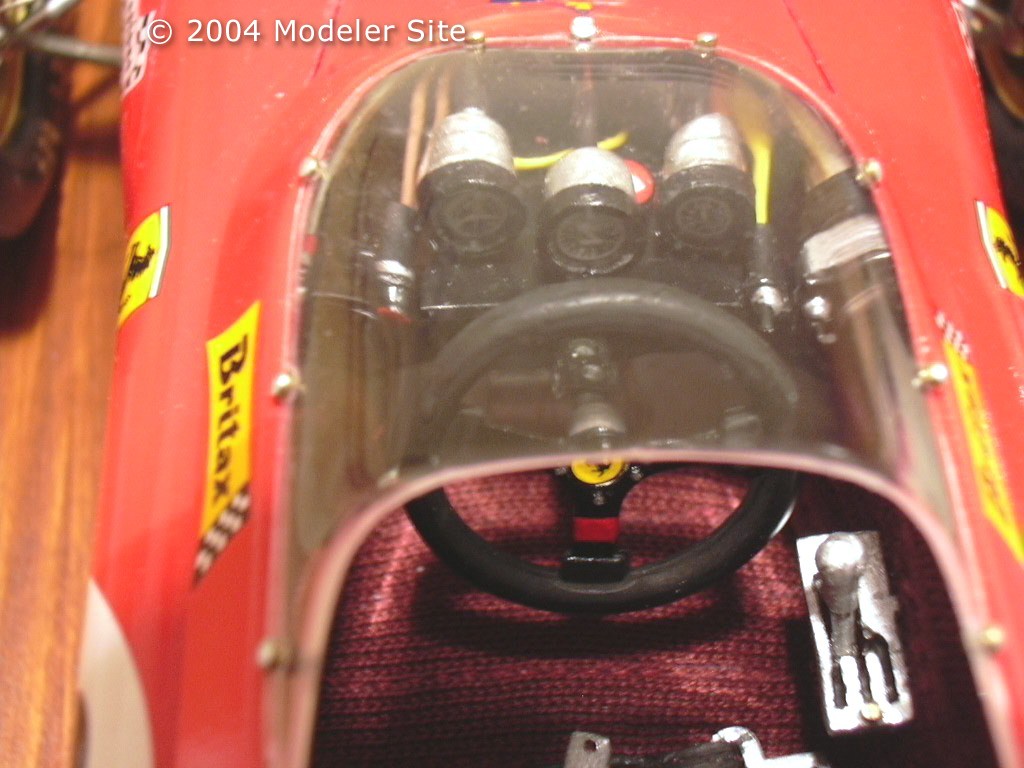 Legal Notice No material from Modeler Site any Web site owned, operated, licensed, or controlled by Mario Covalski & Associated may be copied, reproduced, republished, uploaded, posted, transmitted, or distributed in any way, except that you may download one copy of the materials on any single computer for your personal, non-commercial home use only, provided you keep intact all copyright and other proprietary notices. Modification of the materials or use of the materials for any other purpose is a violation of Mario Covalski & Associated's copyright and other proprietary rights. Read More here > Legal notice I bought this kit about 3 years ago in Cesena (Italian town), I was lucky because there were still a few around, just like the whole Ferrari series in 1/12 scale by Protar. The assembling was not easy, because the Protar product is not as perfect as the Tamiya. But finally I think it was a very good job. I modified largely the engine, the body shop, the piping and the wiring, and I like to underscore particularly the all hand-sewed seat canvas. I added the hand made seat belts, which give a more realistic effect than the original. I scratch built the trumpet-shaped carburetor scoops covered with a black net, the gas piping and the sparking plugs wires, each with its pipe and wire number. Aluminum carters were added to the exhausts, and a painted front cover was added to the roll bar. " The model needed 250 hours to be built.