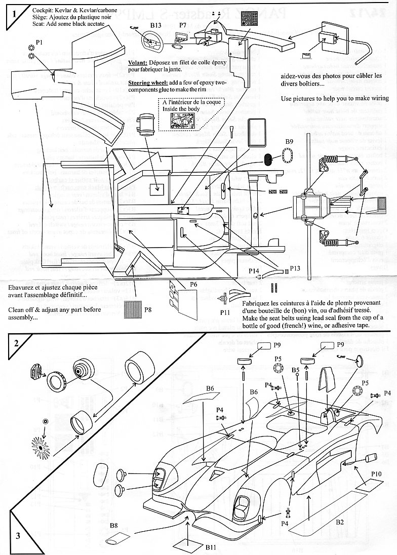 Las instrucciones tienen un despiece completo de partes, e identificación con una guía color, son fáciles de seguir, pero tenga cuidado ya que el auto número 11 está representado en la guía de calcas apuntando en una dirección y el auto número 12 en la otra dirección, tenga cuidado de no cometer un error de usar las calcas del auto número 11 en el lado derecho ya que tienen algunos patrocinadores diferentes, que también están incluidos. Lo que es un detalle perfecto, es una hoja A4 de imágenes en color, que realmente ayudará en el detallado de la cabina, si usted desea hacerlo.